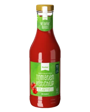 Ketchup ist der Saucen-Klassiker für die Grillsaison und für herzhafte Mahlzeiten. Gesüßt mit Erythrit statt Zucker ist die rote Würzsauce bei Xucker 55% kalorienärmer als vergleichbare Tomatenketchups mit Zucker. Auf 100 g Tomatenketchup werden bei unserer neuen Rezeptur ganze 162 g frische Tomaten eingesetzt, diesmal, oft von unseren Kunden gewünscht, in einer klassischen Glasflasche.