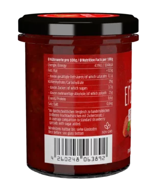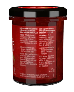 Zuckerarmer Fruchtaufstrich Erdbeere mit Zucker und Süßungsmittel; Früchte: 75,6%.